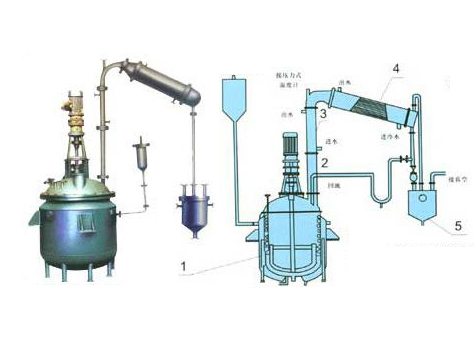 1. 反應鍋 2. 豎式分餾柱 3. 臥式冷凝器 4. 貯水器
